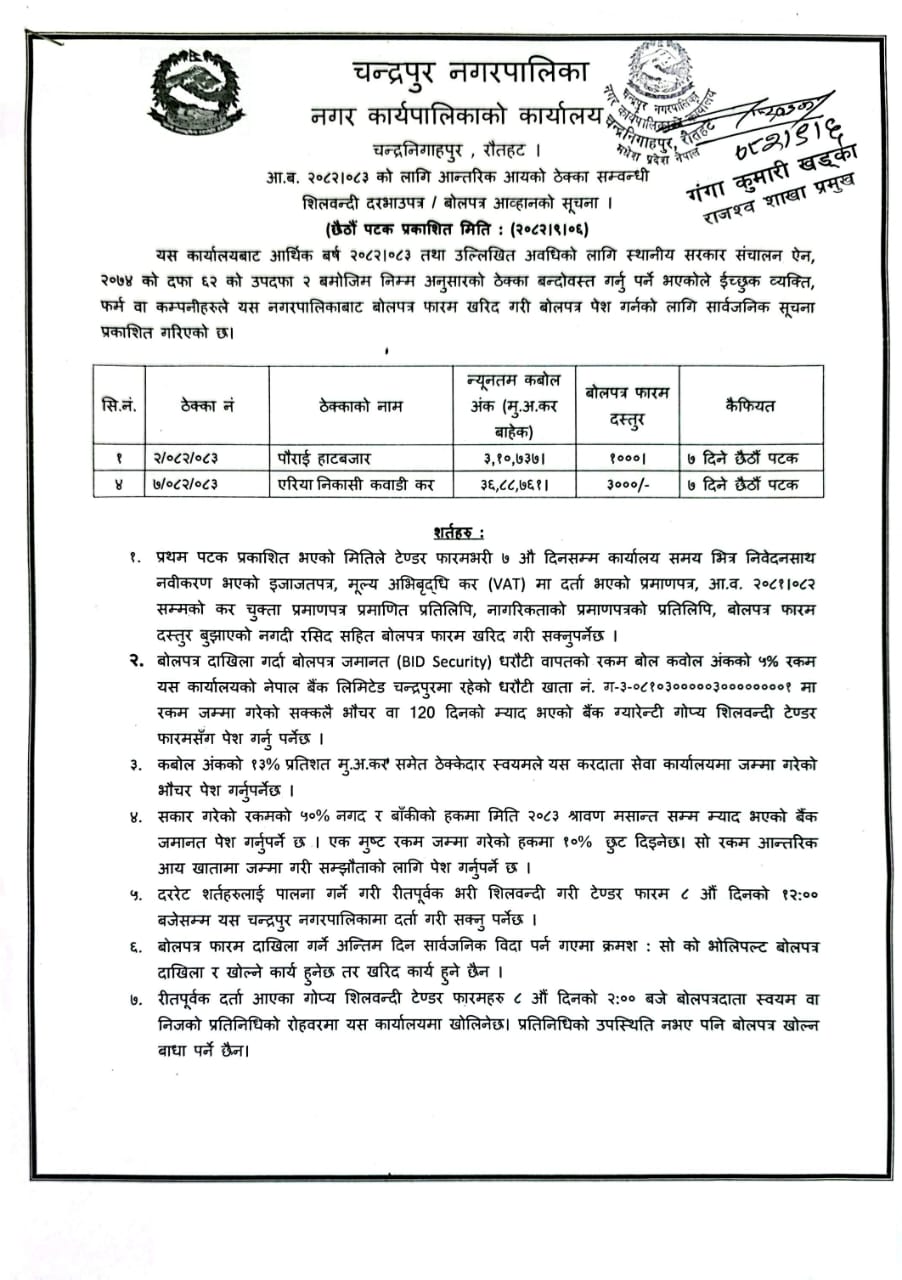 आ.व. २०८२।०८३ को लागि आन्तरिक आय ठेक्का बन्दोबस्त सम्बन्धि पाचौ पटक प्रकाशित सूचना ।