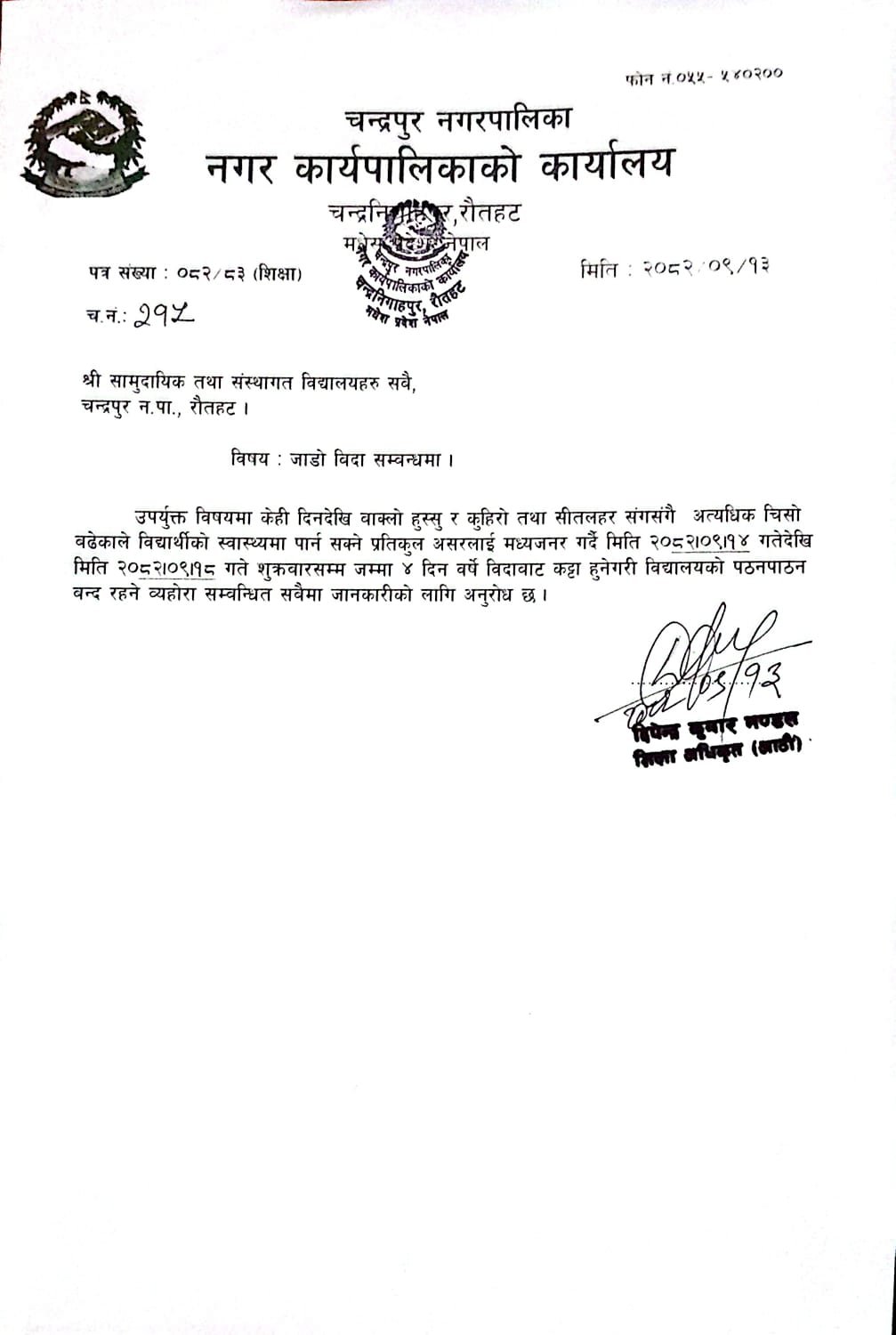 » जाडो विदा सम्बन्धमा । सामुदायिक तथा संस्थागत विद्यालयहरु सबै, चन्द्रपुर नगरपालिका, रौतहट ।