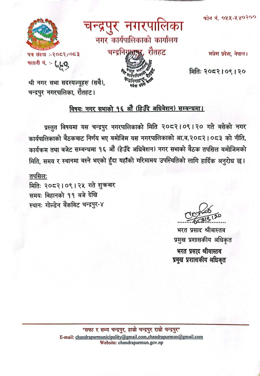नगर सभाको १६ औं (हिउँदे अधिवेशन) सम्बन्धमा ।