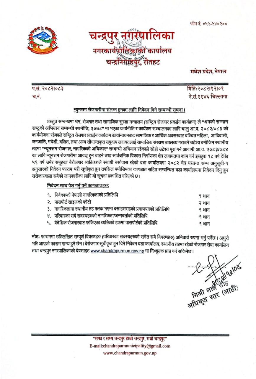 न्यूनतम रोजगारीमा संलग्न हुनका लागि निवेदन दिने सम्बन्धि सूचना ।