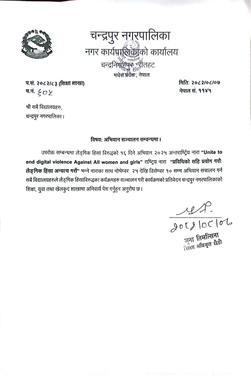 जाडो विदा सम्बन्धमा । सामुदायिक तथा संस्थागत विद्यालयहरु सबै, चन्द्रपुर नगरपालिका, रौतहट ।