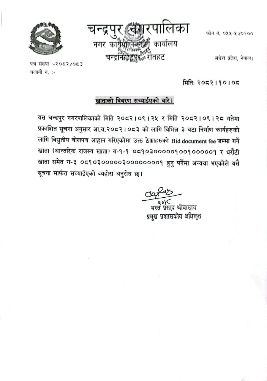 अा.व. २०७५।०७६ काे ठेक्का सम्बन्धी शिलबन्दी बाेलपत्र अाहवानकाे सूचना । प्रथम पटक प्रकाशित मिति २०७५।०४।१२